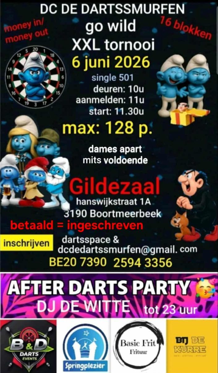 Inschrijven kan via Dartsspace of van dcdedartssmurfen@gmail.com