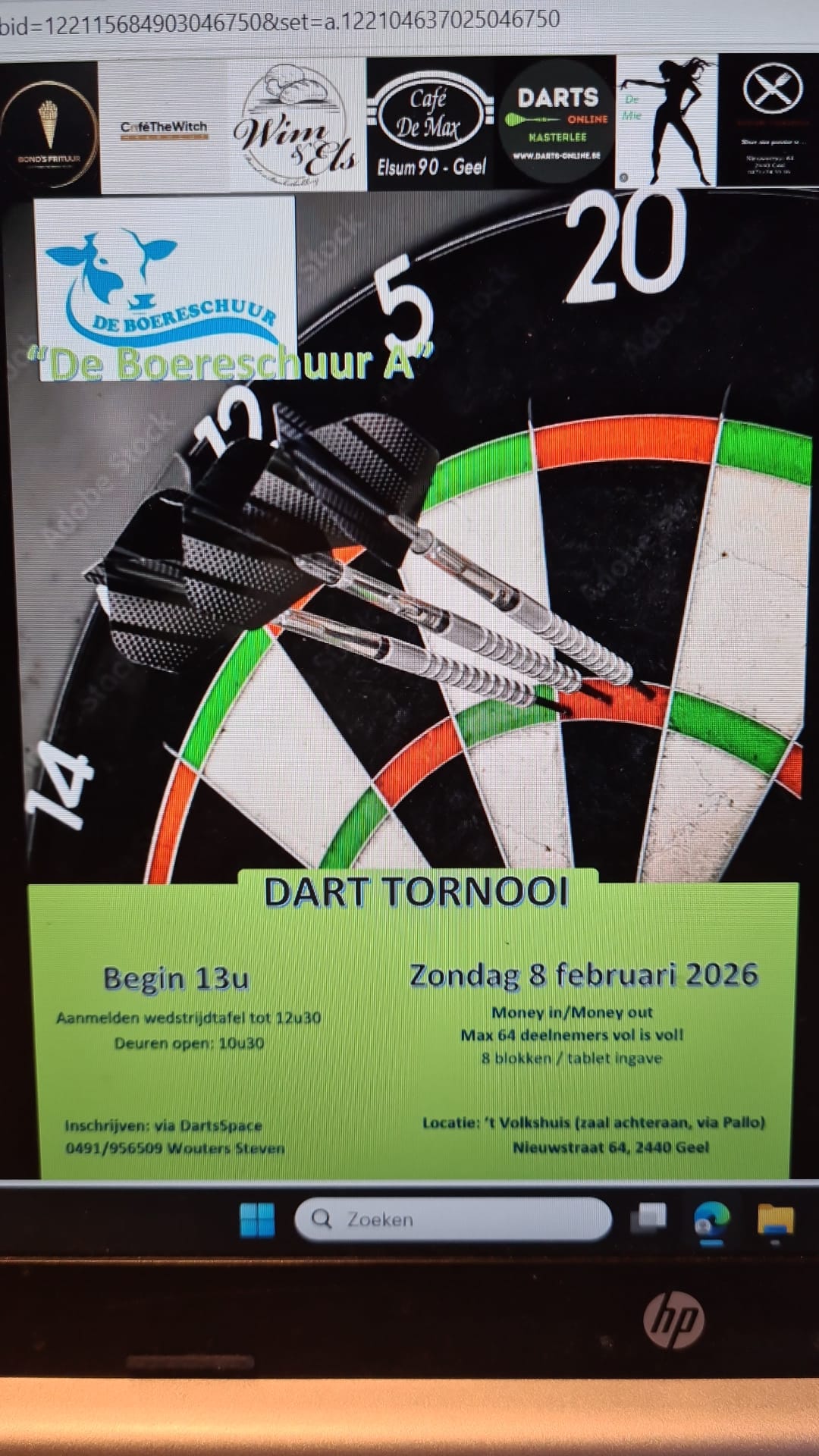 DC Boereschuur A geeft op 8/2 een dartstornooi in het volkshuis, nieuwstraat 64 te Geel. 501 dubbel out, 10€ pp, money in money out. Start om 13u. We spelen op 8 blokken, ingave op tablet.