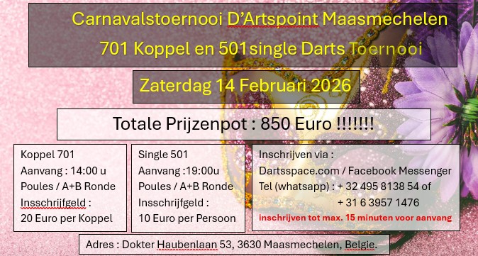 You can register for this tournament using dartsspace until:Totale prijzenpot 850 euro !!!!!