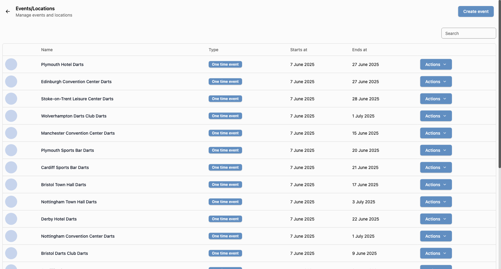 De Evenementen/Locaties overzichtspagina biedt een uitgebreide interface voor het bekijken en beheren van al je evenementen en locaties. Het stelt je in staat om efficiënt te zoeken en evenementen te beheren.