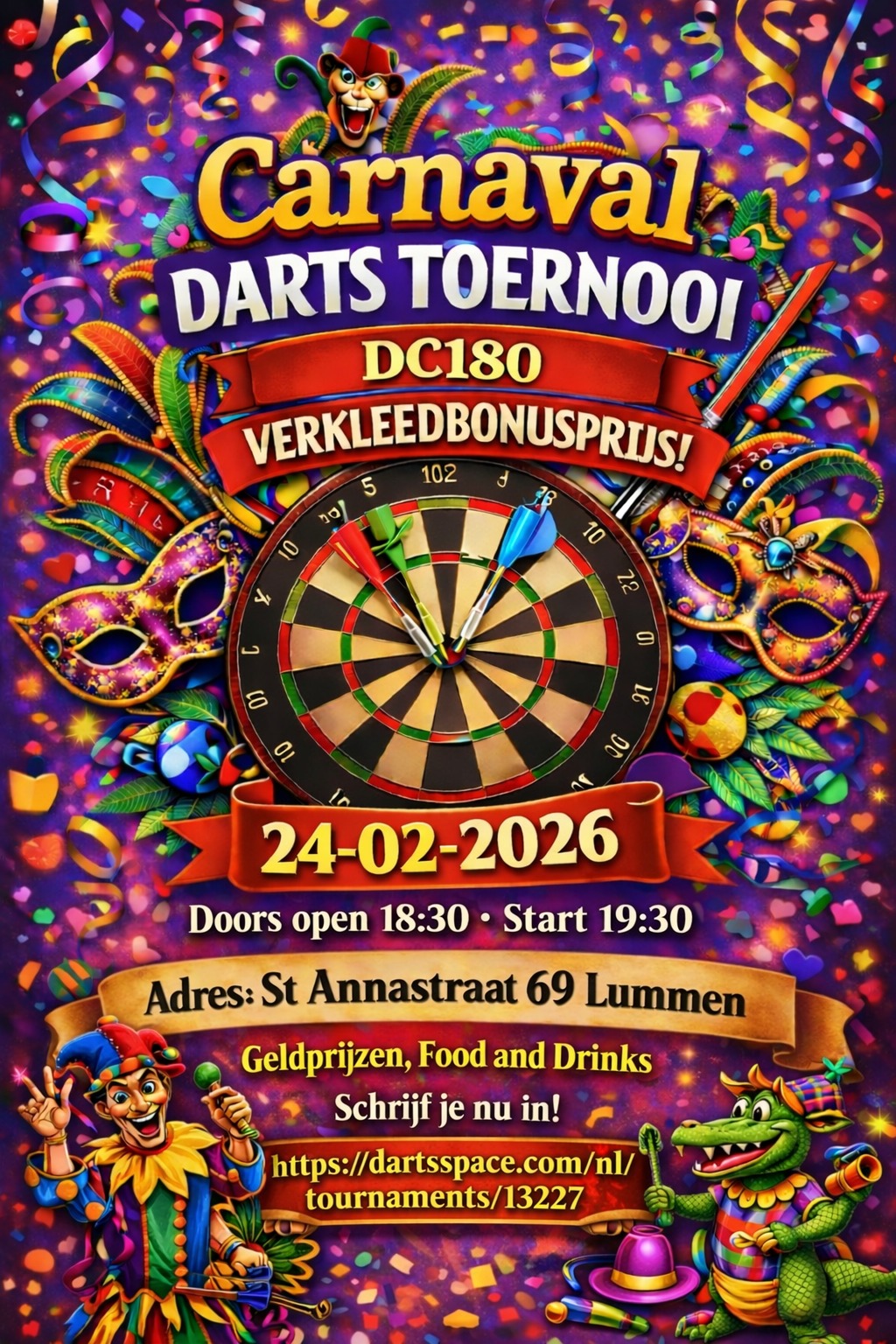 Je kunt je voor dit toernooi inschrijven via dartsspace tot:24/02/26 Vieren we bij DC180 Carnaval, maar niet zomaar Carnaval we gaan HELEMAAAAAL CRAZYYYY.