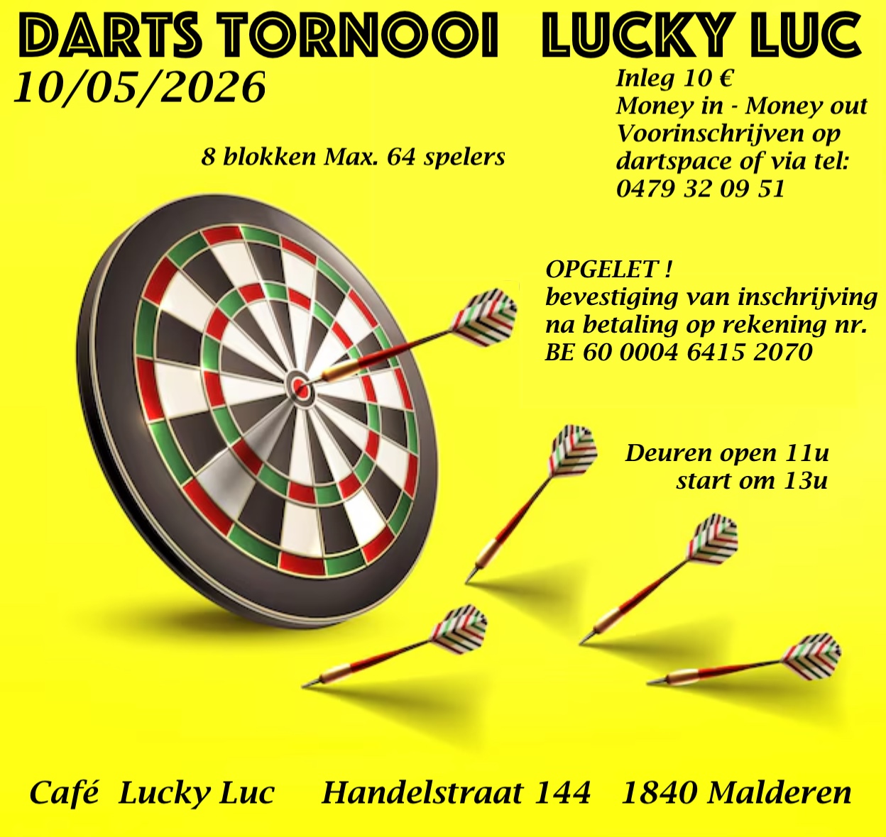 Max 64 Spelers .......money in money uit...... Er word gespeeld op 8 Blokken....deuren open 11uur start om 13 uur... voorinschrijving op dartspace of telefoonnr. 0479 32 09 51 let op!! bevestiging van inschrijving na betaling op rekeningnr. BE60 0004 6415 2070 Adres Lokaal: Handelsstraat 144 te 1840 Malderen